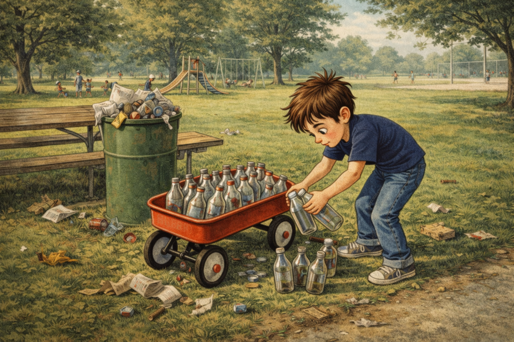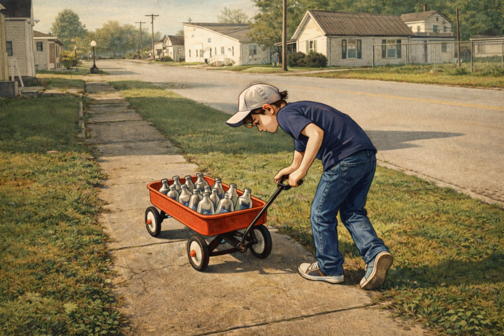 In the early 1960s, soda came in glass bottles with a two-cent deposit. I had a rusty red wagon and a plan. I walked the neighborhood looking for discarded bottles. Twenty to thirty a day wasn’t unusual. The two local parks were gold mines after a weekend.
